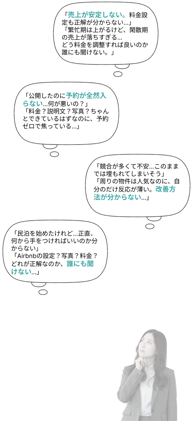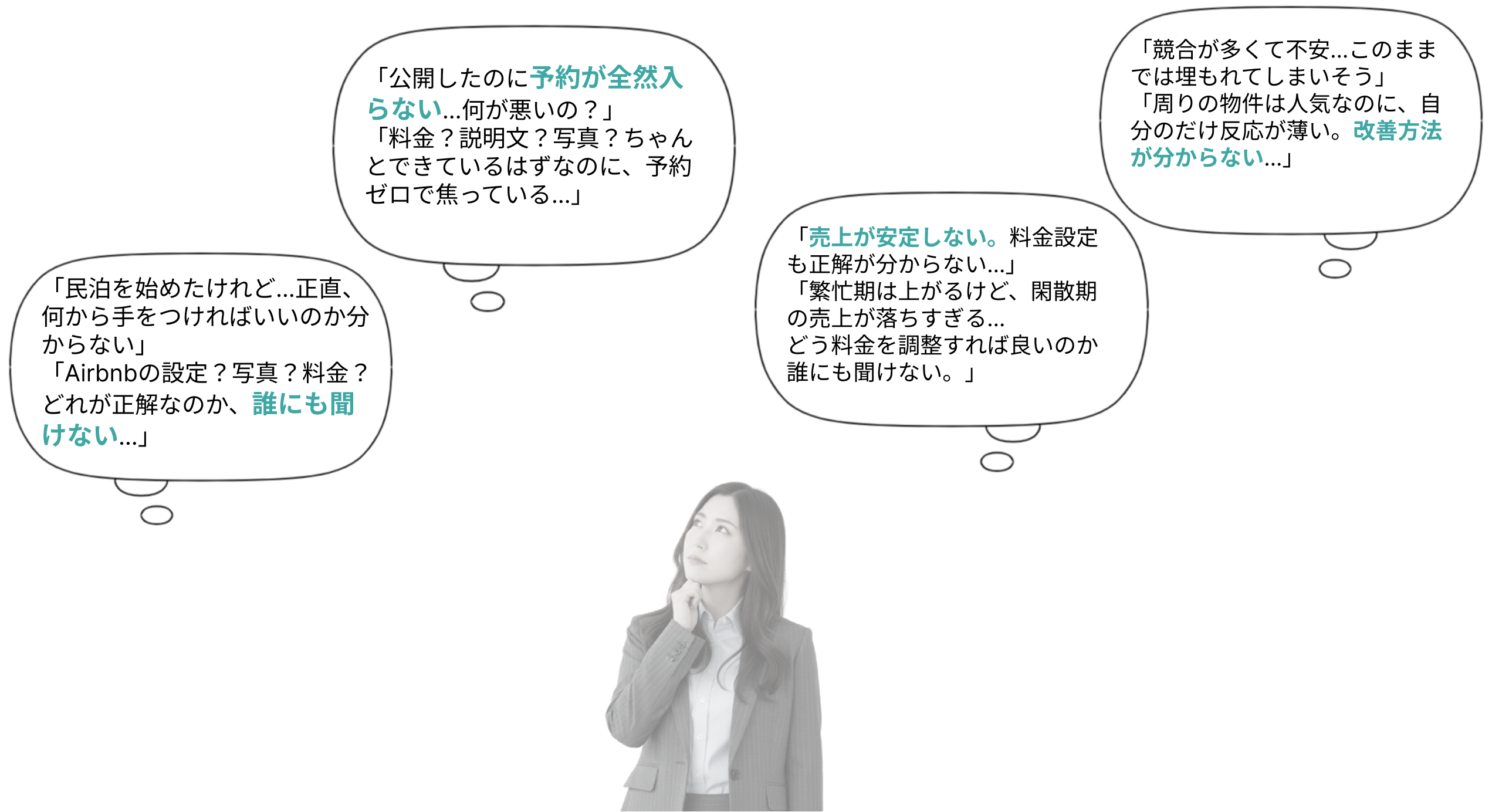 予約サイト(OTA)のアルゴリズム解析から、ゲスト心理を掴む空間づくり、そして高評価を獲得するコミュニケーションまで。 数多の民泊物件を見てきたプロフェッショナルが、あなたの物件のポテンシャルを最大限に引き出し、収益と資産価値の向上を実現します。