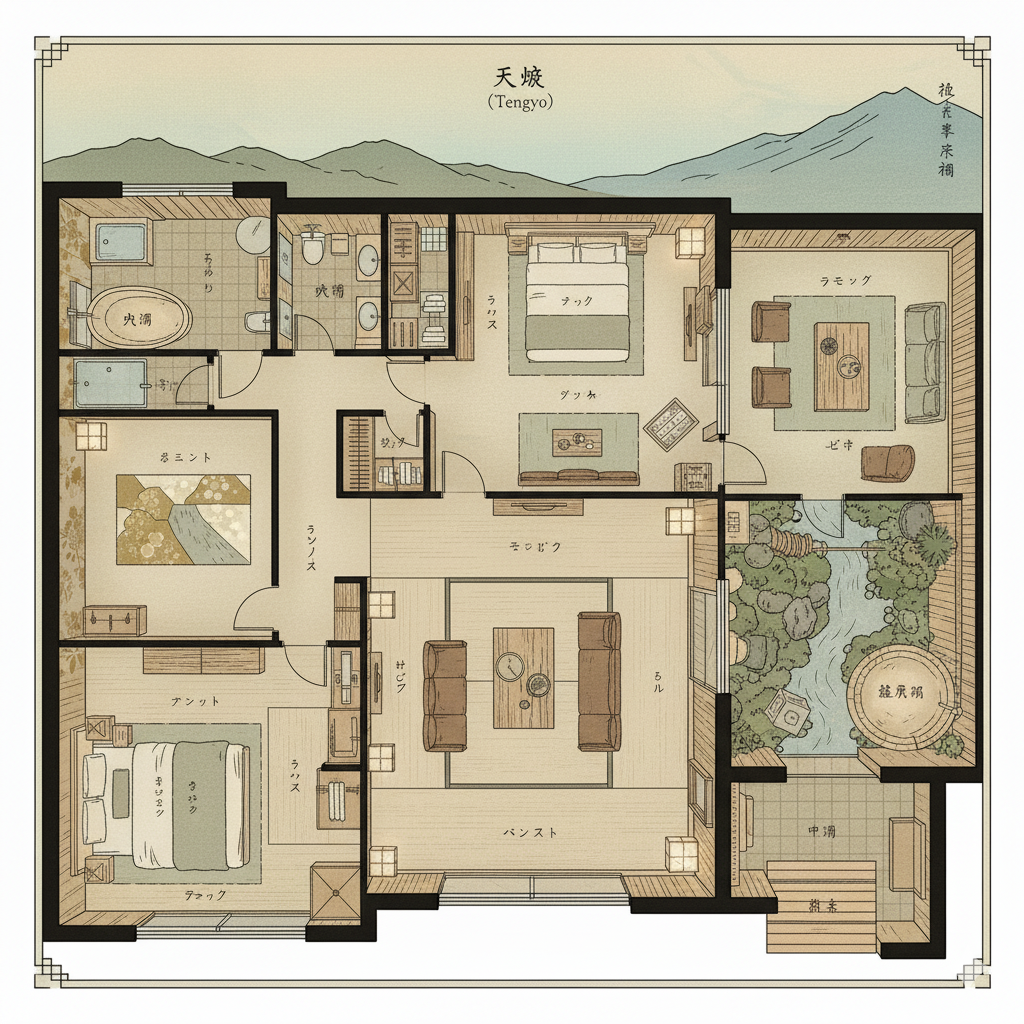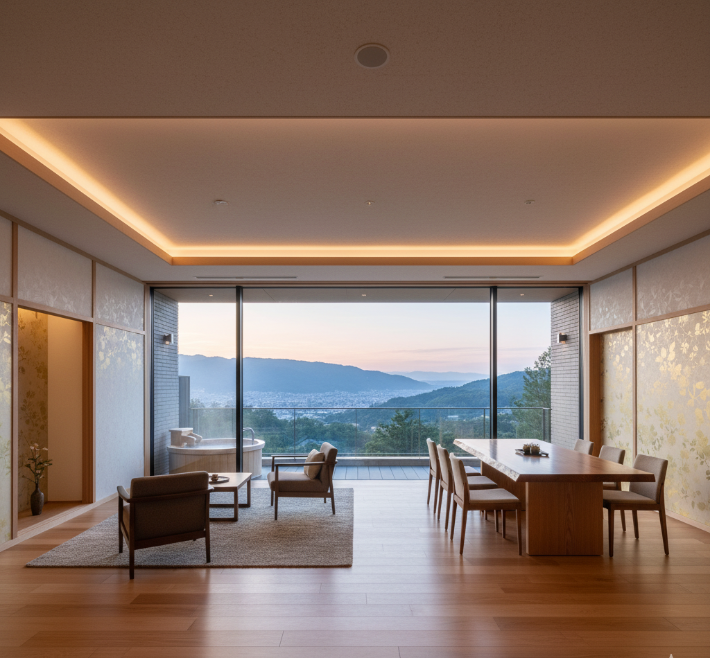 - 特徴: 東山を望むパノラマビュー、檜の露天風呂、ダイニングスペース、専用コンシェルジュサービス