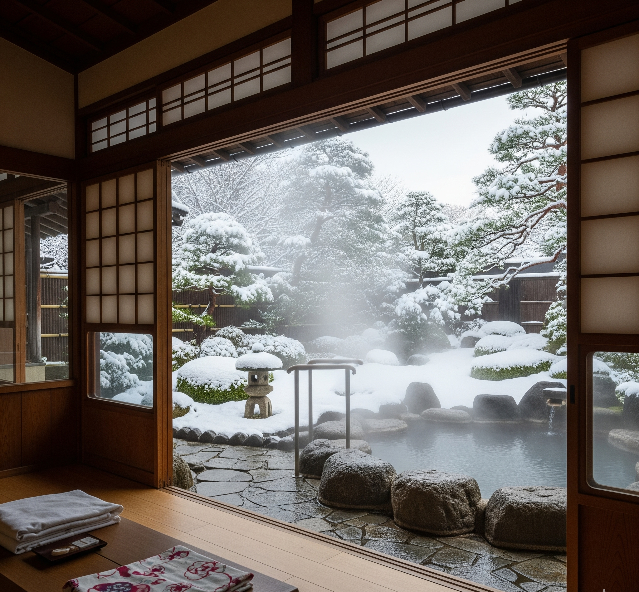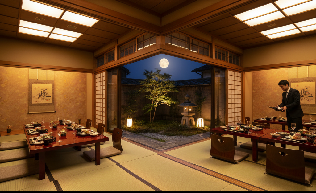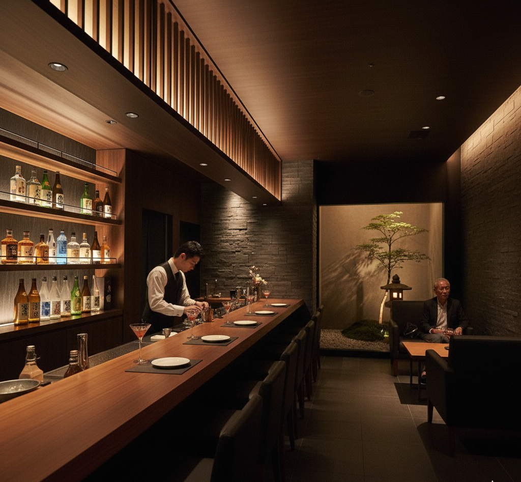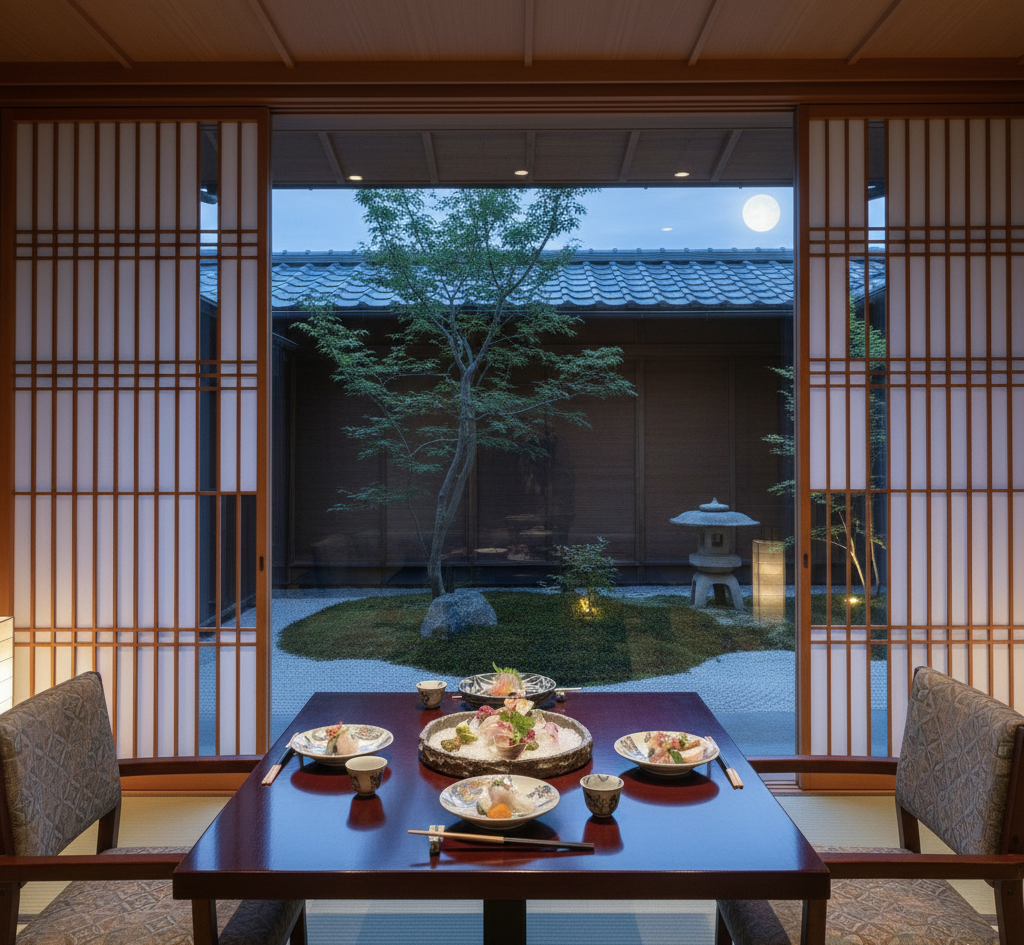 エントランスを抜けると、京の職人技が光る伝統的な意匠と、モダンなデザインが融合した空間がゲストを迎えます。例えば、漆喰の壁に繊細な箔絵が施され、床には天然木の一枚板が配されるなど、随所に本物の素材と手仕事の温もりが感じられます。