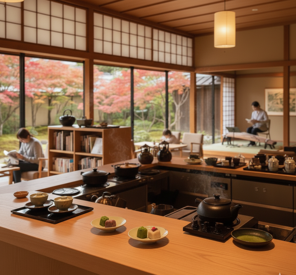 京都の厳選されたお茶やコーヒー、季節の和菓子などを提供(宿泊者無料)。