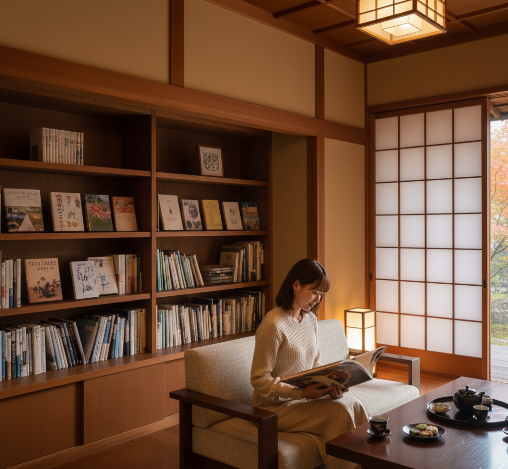 ライブラリーコーナーを併設し、京都に関する書籍や美術書を自由に閲覧可能。