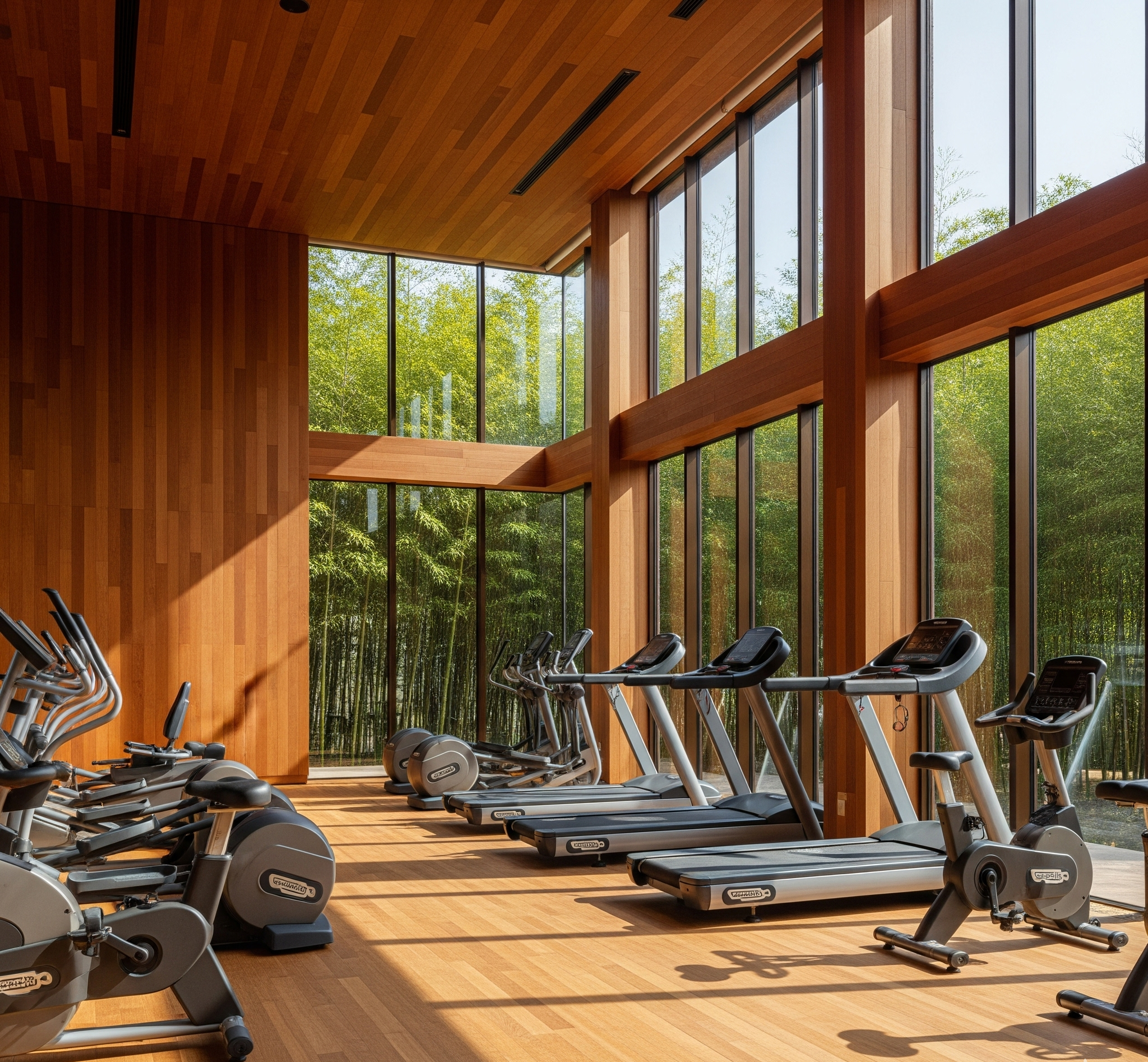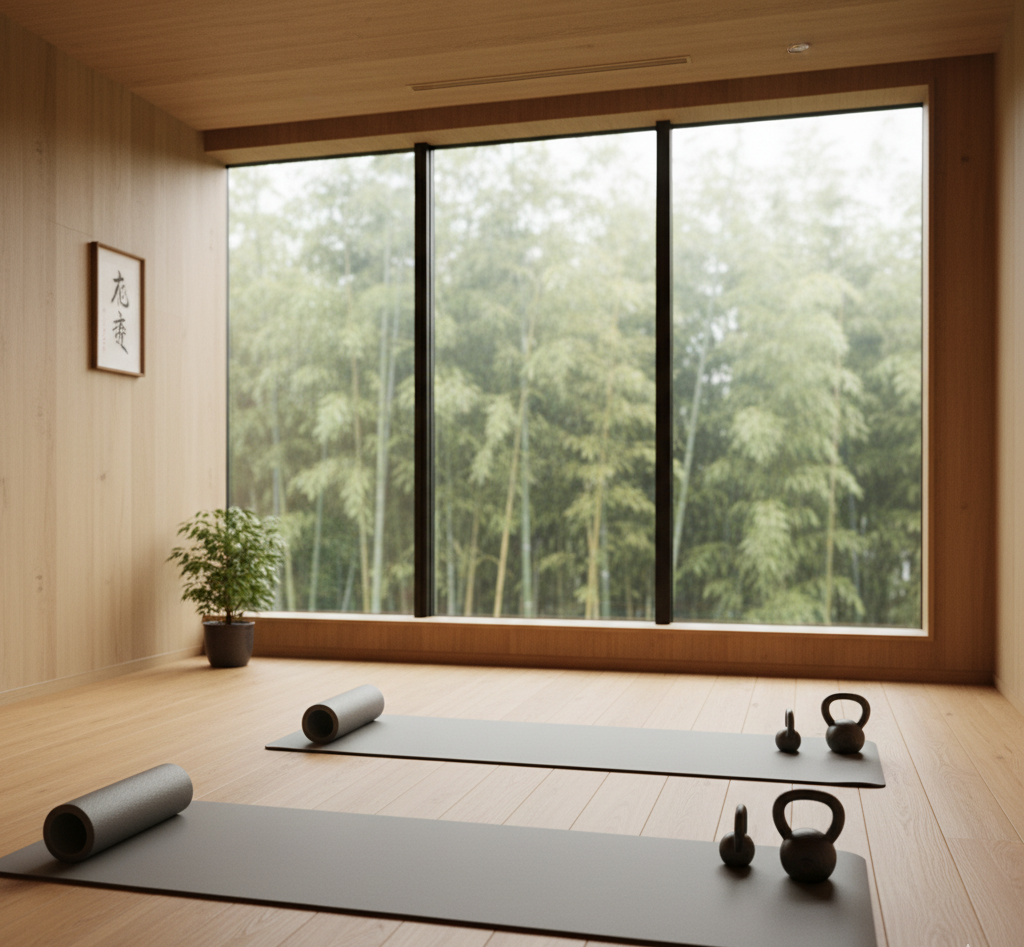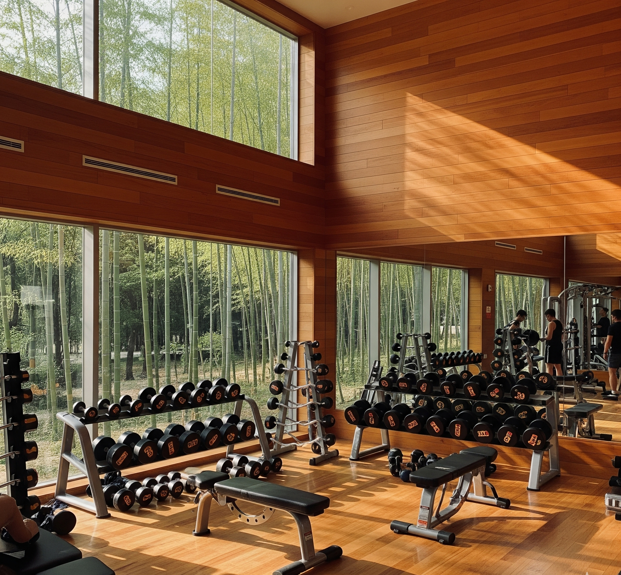 窓からは竹林が見え、自然を感じながら運動できる開放的な空間。