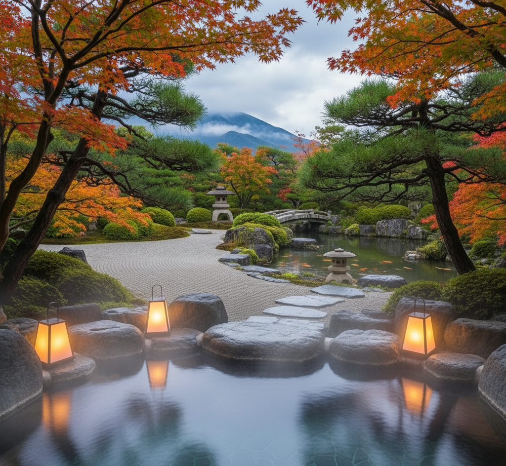 露天風呂からは、手入れの行き届いた日本庭園が広がり、夜にはライトアップされた幻想的な景色が楽しめる。