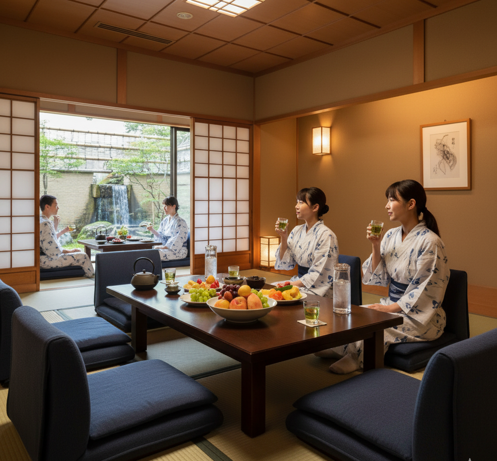湯上りには、お茶や冷水、季節の果物を提供する休憩スペースを併設。