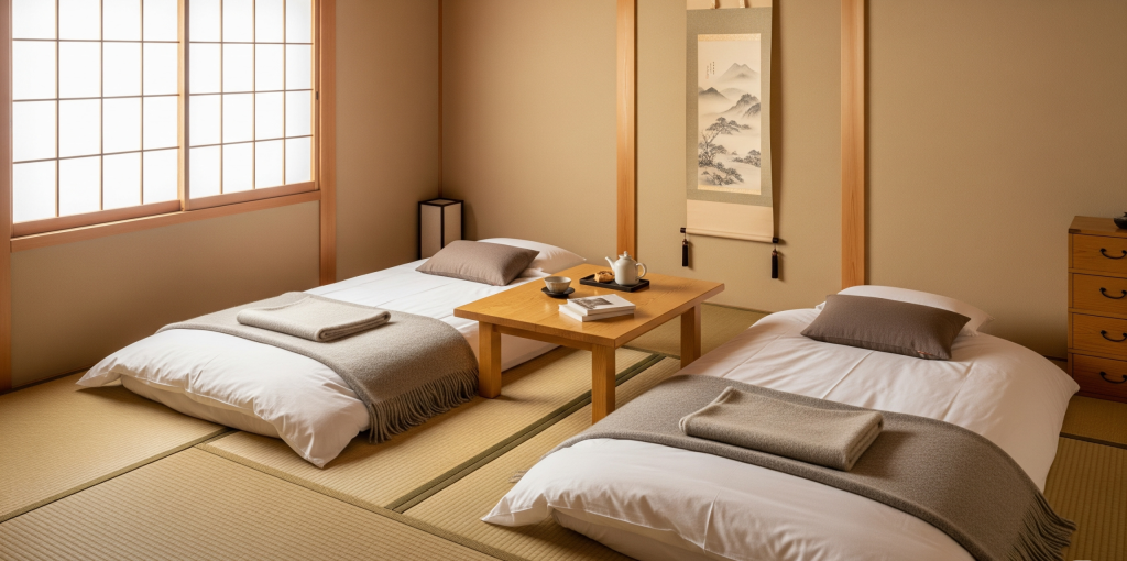 布団は京都の職人によって特注で作られた滑らかな肌触りの羽毛布団になります。