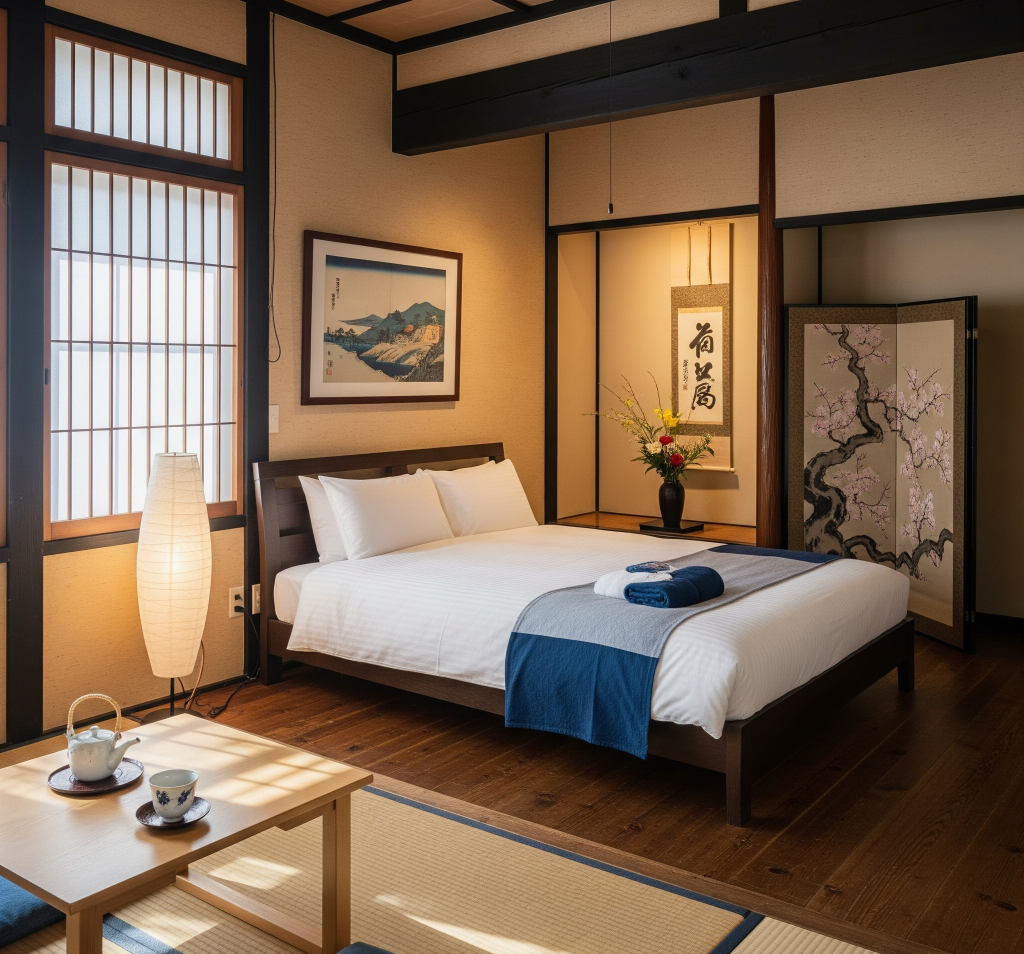 ベッドルームは和と洋を組み合わせた落ち着いた空間になっております、より自然な空間を求めて和のコンセプトからあえて外ずすことでよりリラックスできる空間となっております